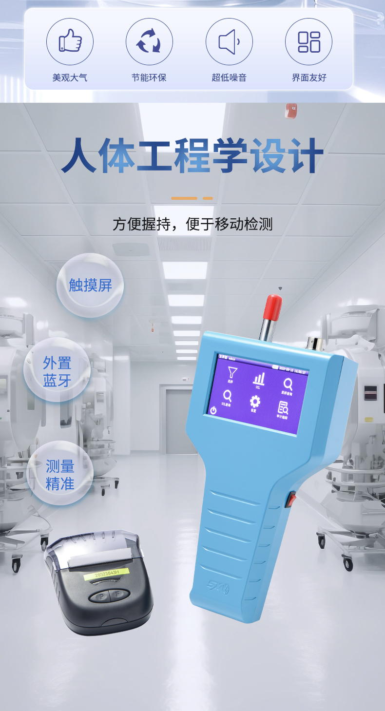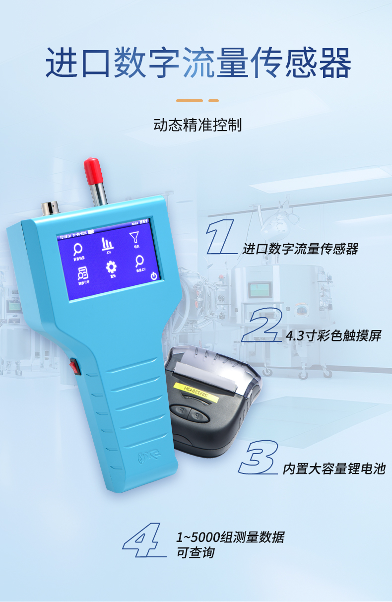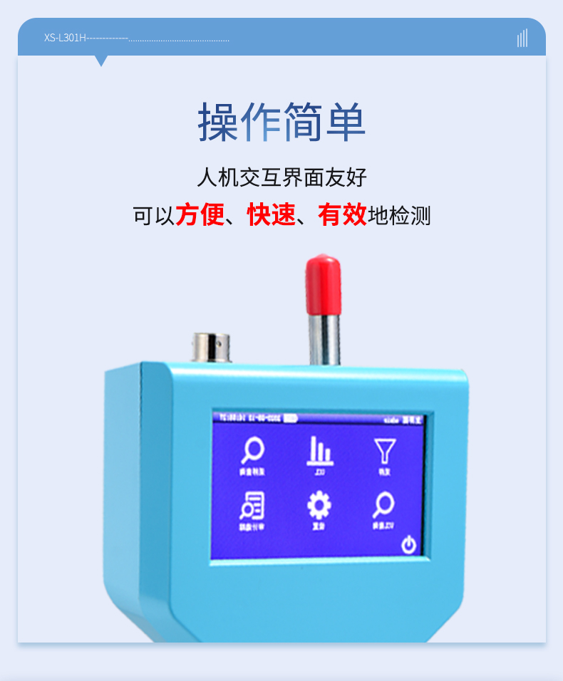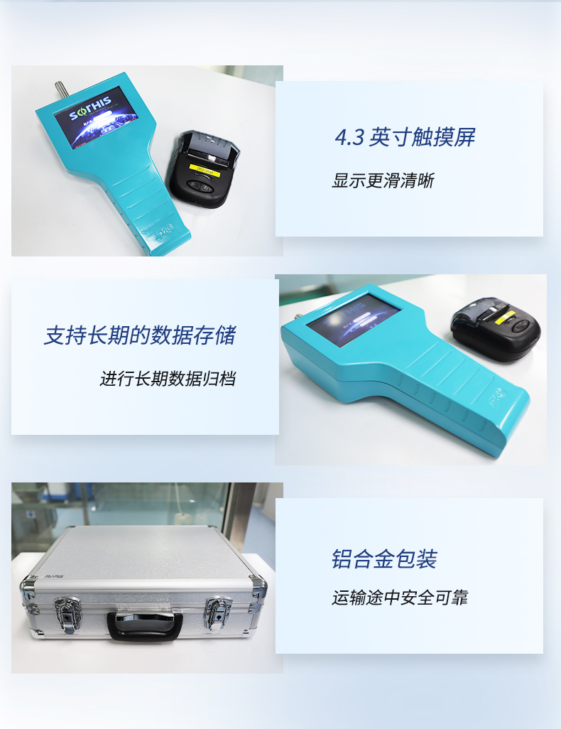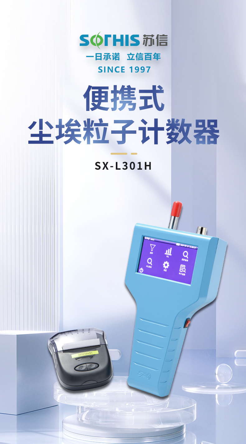SX-L301H型尘埃粒子计数器是我司研发的新一代触摸屏手持式尘埃粒子计数器,含义是采样流量为2.83L/min±5%(即0.1CFM)。仪器采用4.3英寸彩色触摸屏,外形美观大气,机身采用全ABS材料,表面喷塑处理;采用气泵,连续工作稳定,超低噪音,节能环保;内置进口数字流量传感器,采样流量动态精准控制;供电可使用交流供电,也可使用内置的大容量锂电池供电,方便应用于无交流电场所的移动检测。 仪器操作简单,人机交互界面友好,可以方便、快速、有效地检测净化环境中的悬浮粒子,是目前生物制药,电子半导体,新能源等行业快速检测洁净室洁净度的首选产品。